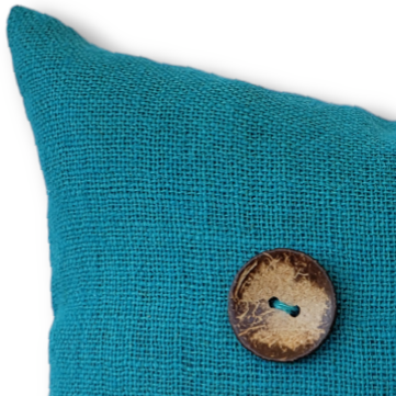 Introducing a luxurious addition to your home decor - the Coastal Teal Burlap lumbar Decorative Pillow Cover. Made from the finest Teal burlap fabric, accented with large coconut buttons and meticulously lined and double stitched by designer Fiona Kimberly. Transform your space with a touch of boho coastal elegance.