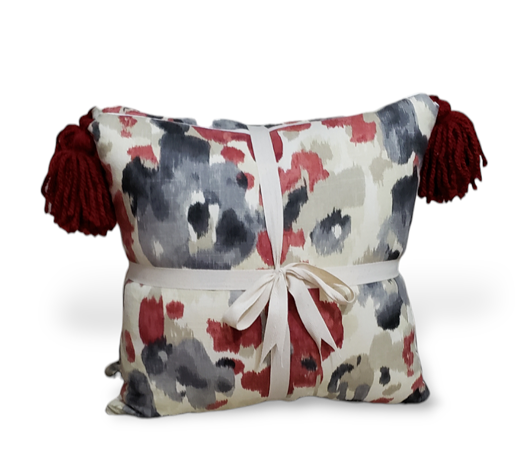 Experience a touch of luxury with our handmade Landsmeer Currant Pillow Cover. Crafted from the finest Dwell Studios for Robert Allen Home Landsmeer Currant fabric featuring timeless shades of red, gray, and ivory, this cushion cover is accented with luxurious large red tassels. Secured with a reversible invisible zipper, this exquisite pillow cover adds a touch of sophisticated elegance to any space.