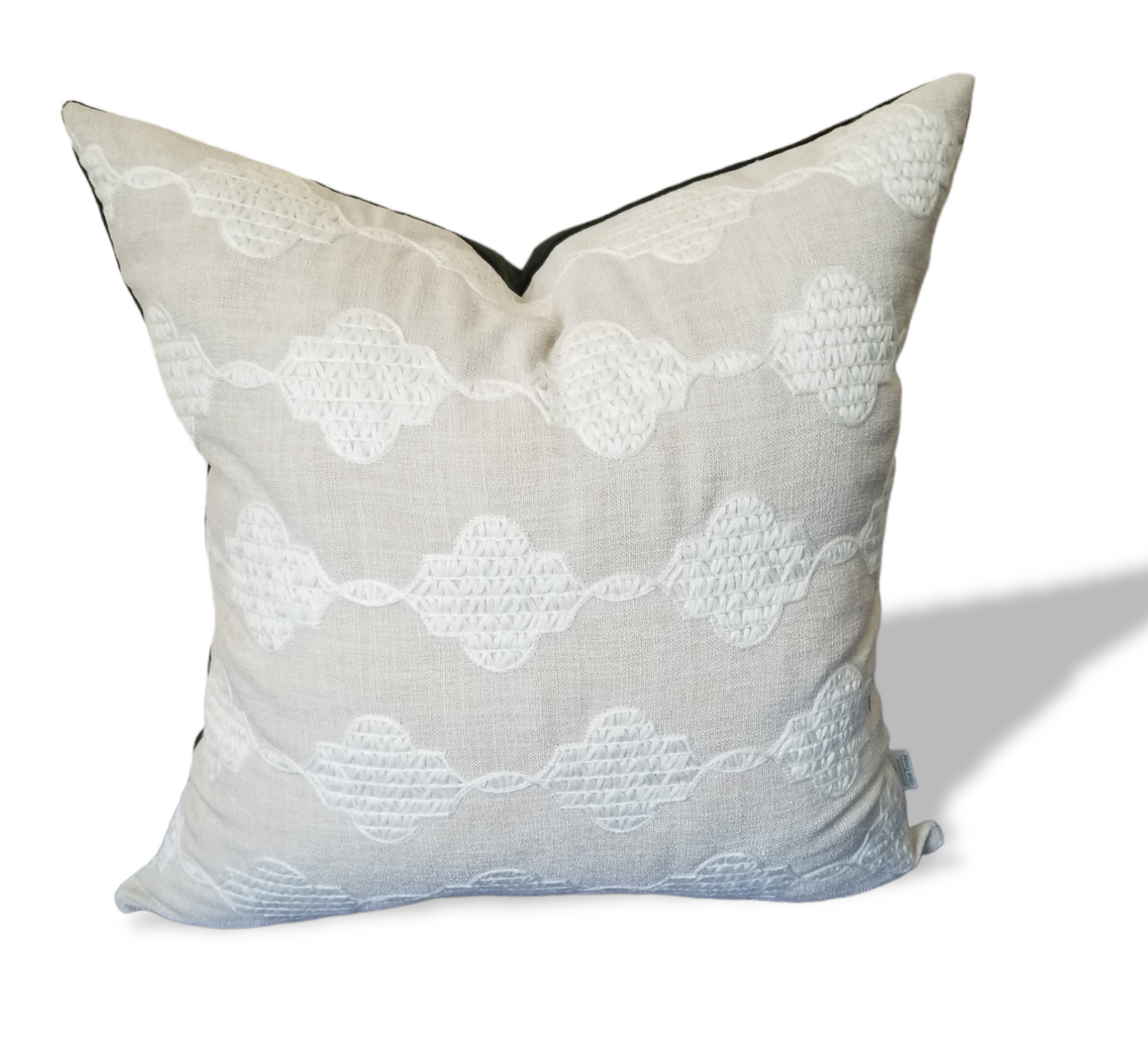 Soft elegance is what our Jacqueline Emerald is. This Beige and emerald green embroidered decorative designer pillow sets the tone for a luxurious livingroom, bedroom, guestroom or foyer.