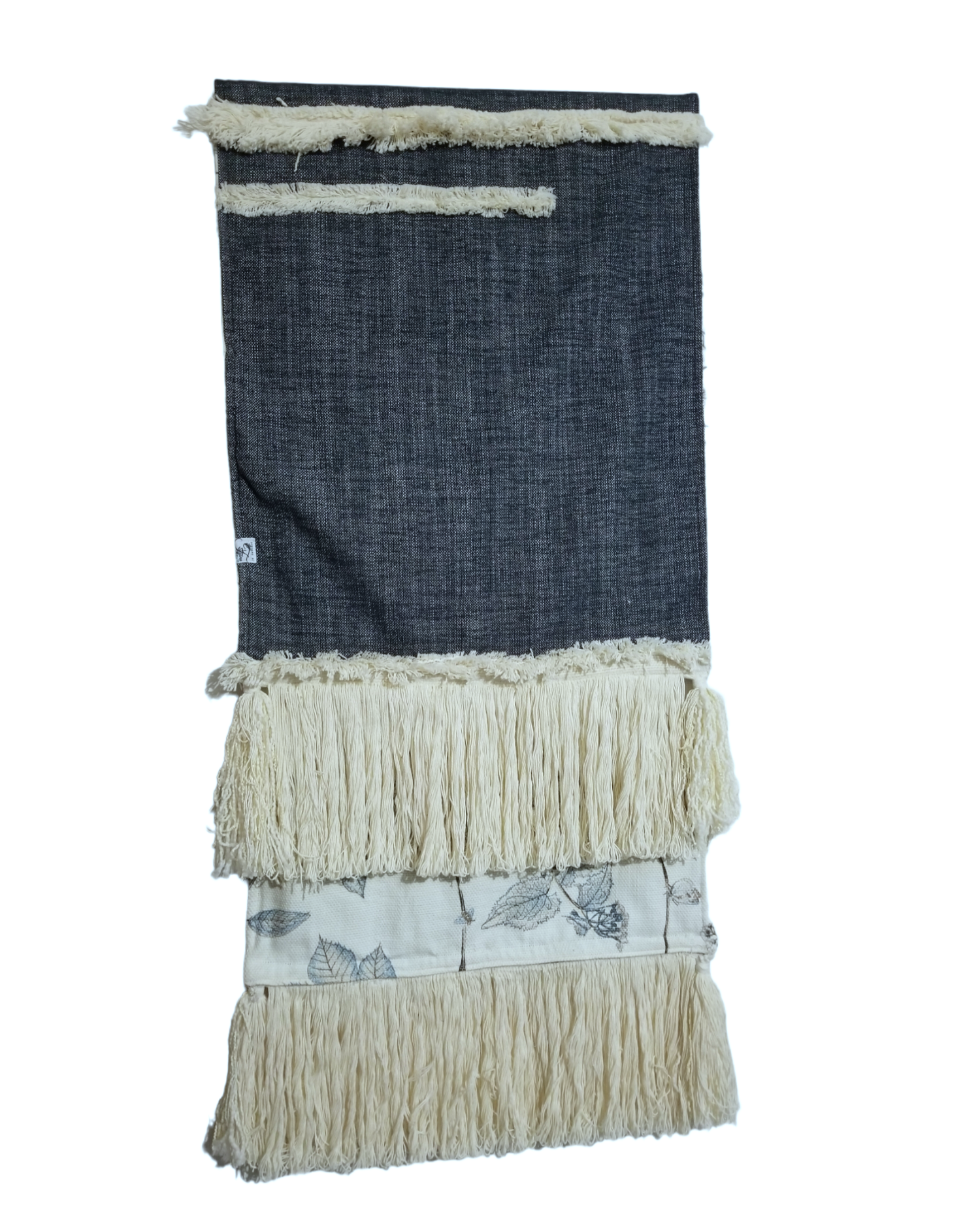 Bring effortless style to your home with this handmade limited edition luxury throw/runner. Woven in an intricate pattern of beige, black and blue, this 18x70 in piece is made from P Kaufmann Arboretum Fabric, with a woven reverse and tasseled edge. A truly unique piece for the boho decor enthusiast.