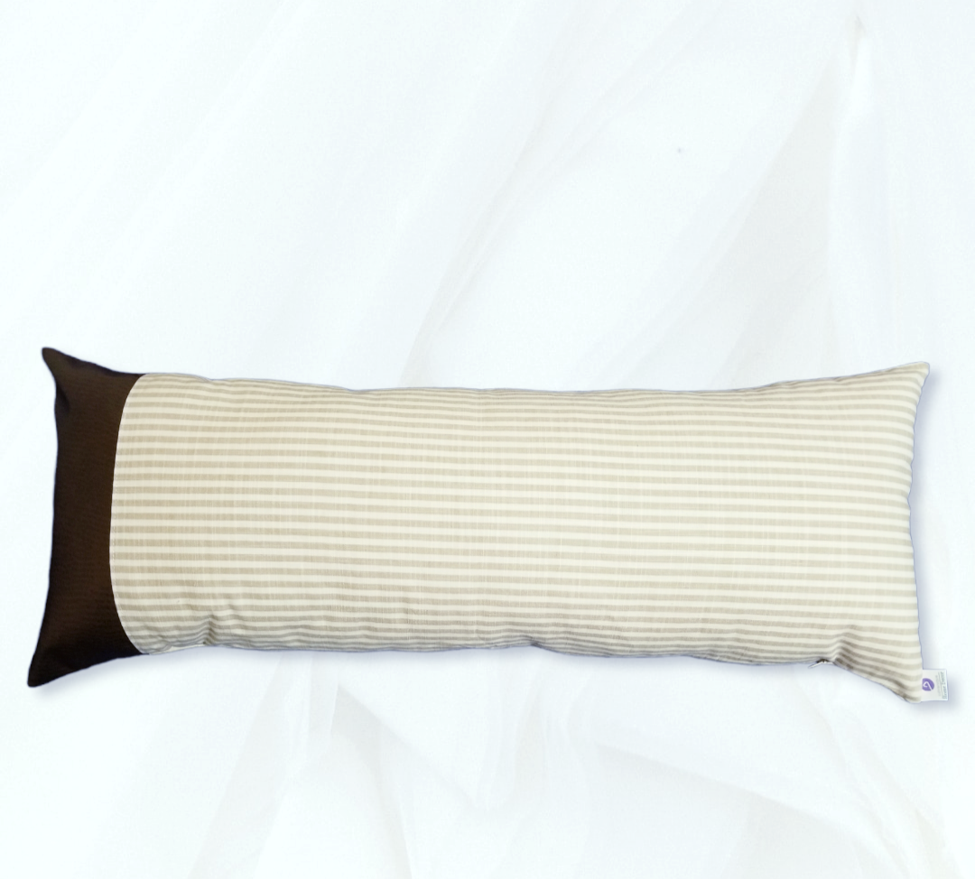 Luxury decorative Beige Stripe Pillow with brown leatherette strip.