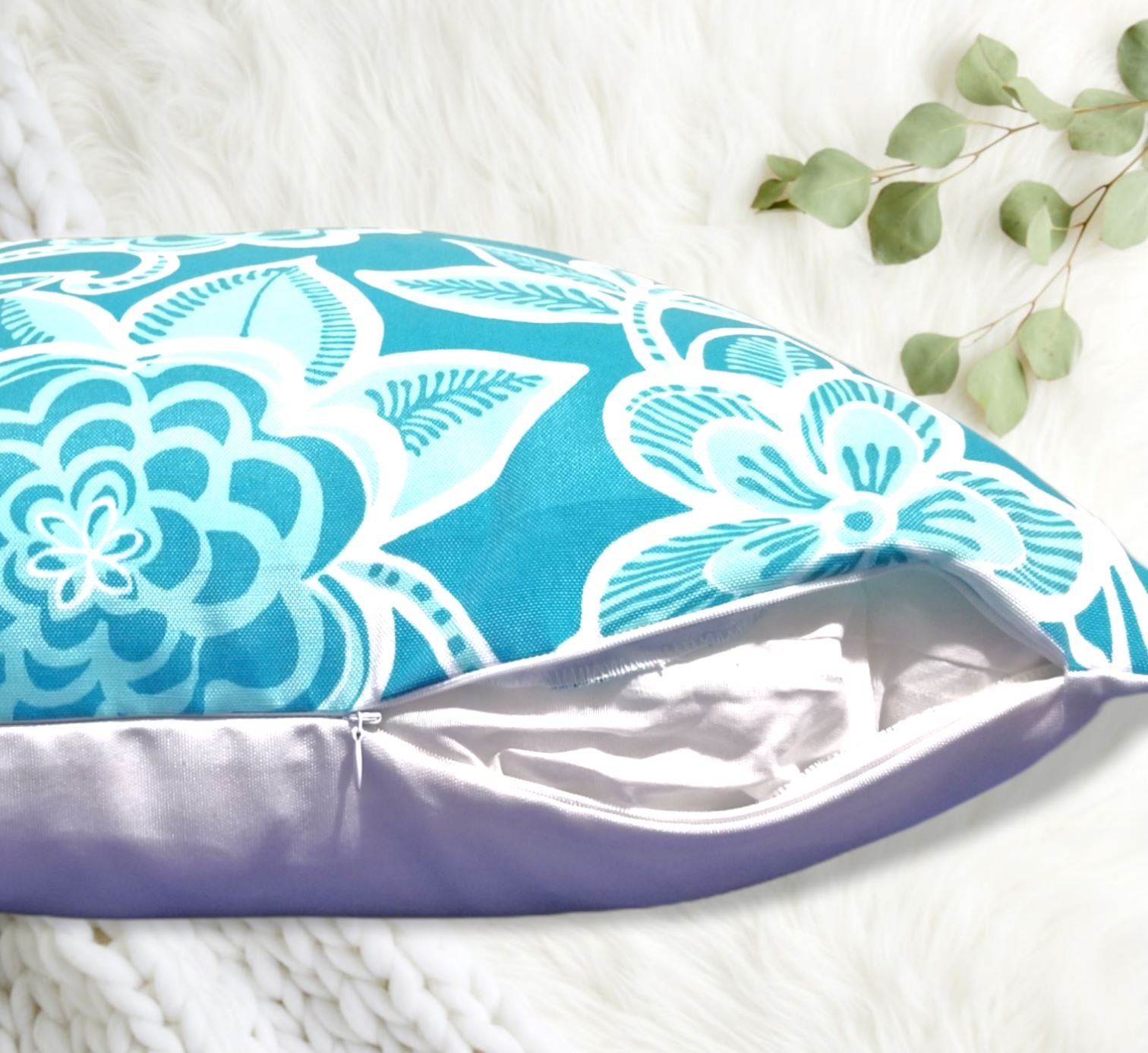 This fun and exciting Blue floral outdoor fabric makes a perfect decor piece for your outdoor patio, porch or foyer. This tropical spring colored Accent throw pillow comes in a 20 inch square with white back and 10x22 Lumbar with matching back. Complete with invisible zipper and sealed edges for durability.