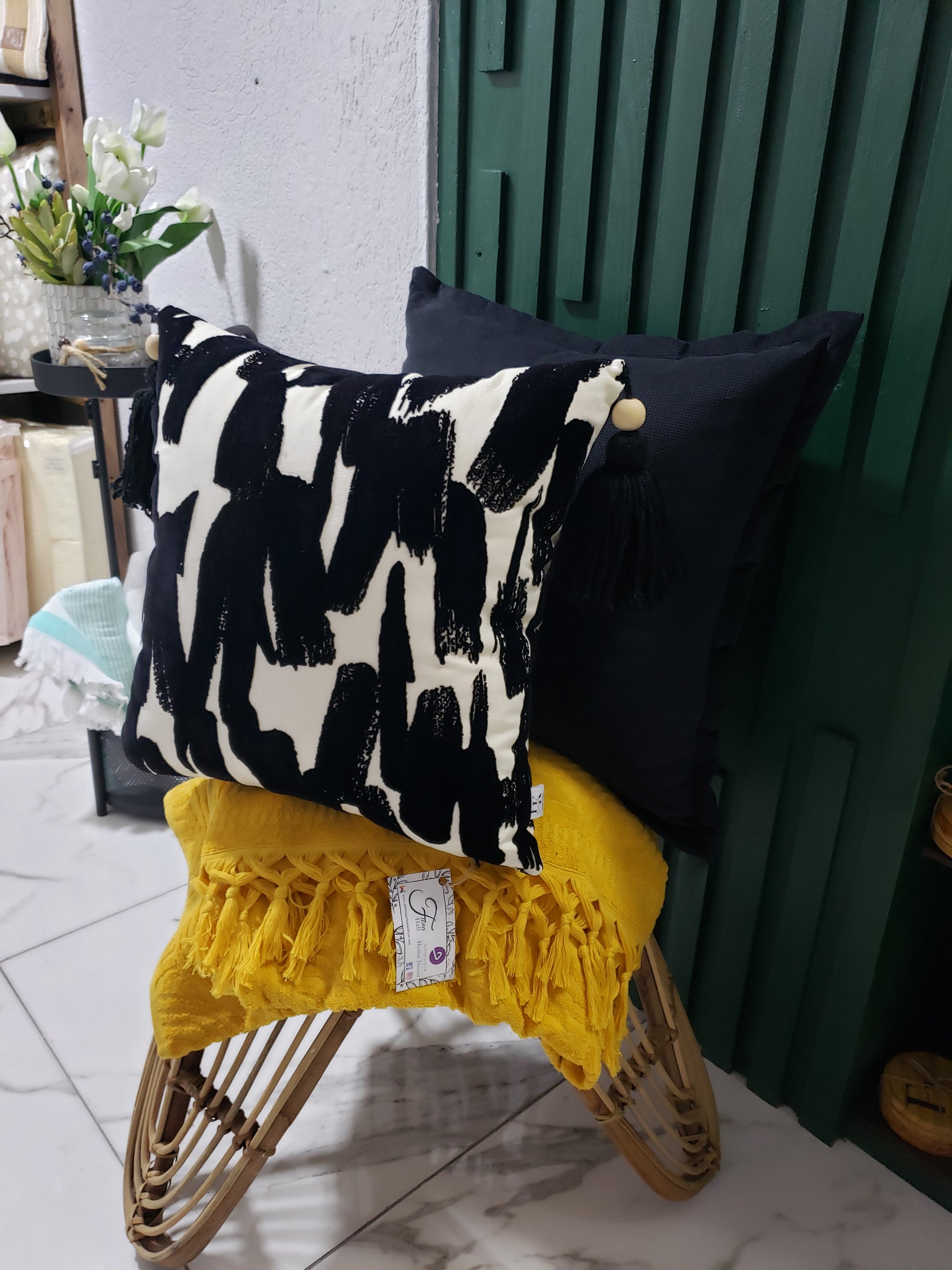 Elevate your home decor with Janaya Opulent Strokes Luxury Designer Cushions. These handcrafted cushions feature elegant black and white cut velvet fabric with bold black paint strokes patterns. Bring a touch of luxury to your living space with these designer cushions that add both texture and style to your furniture.