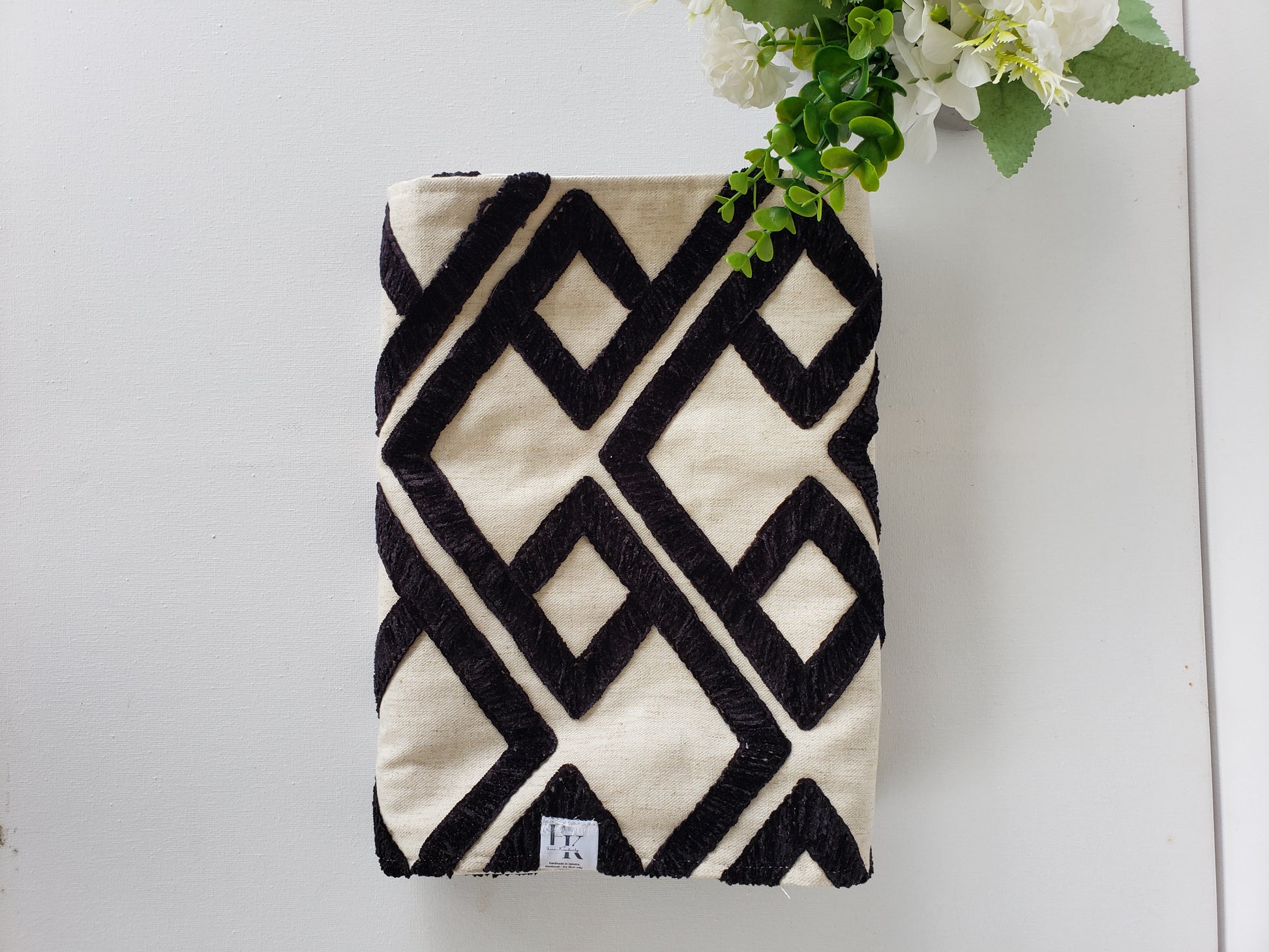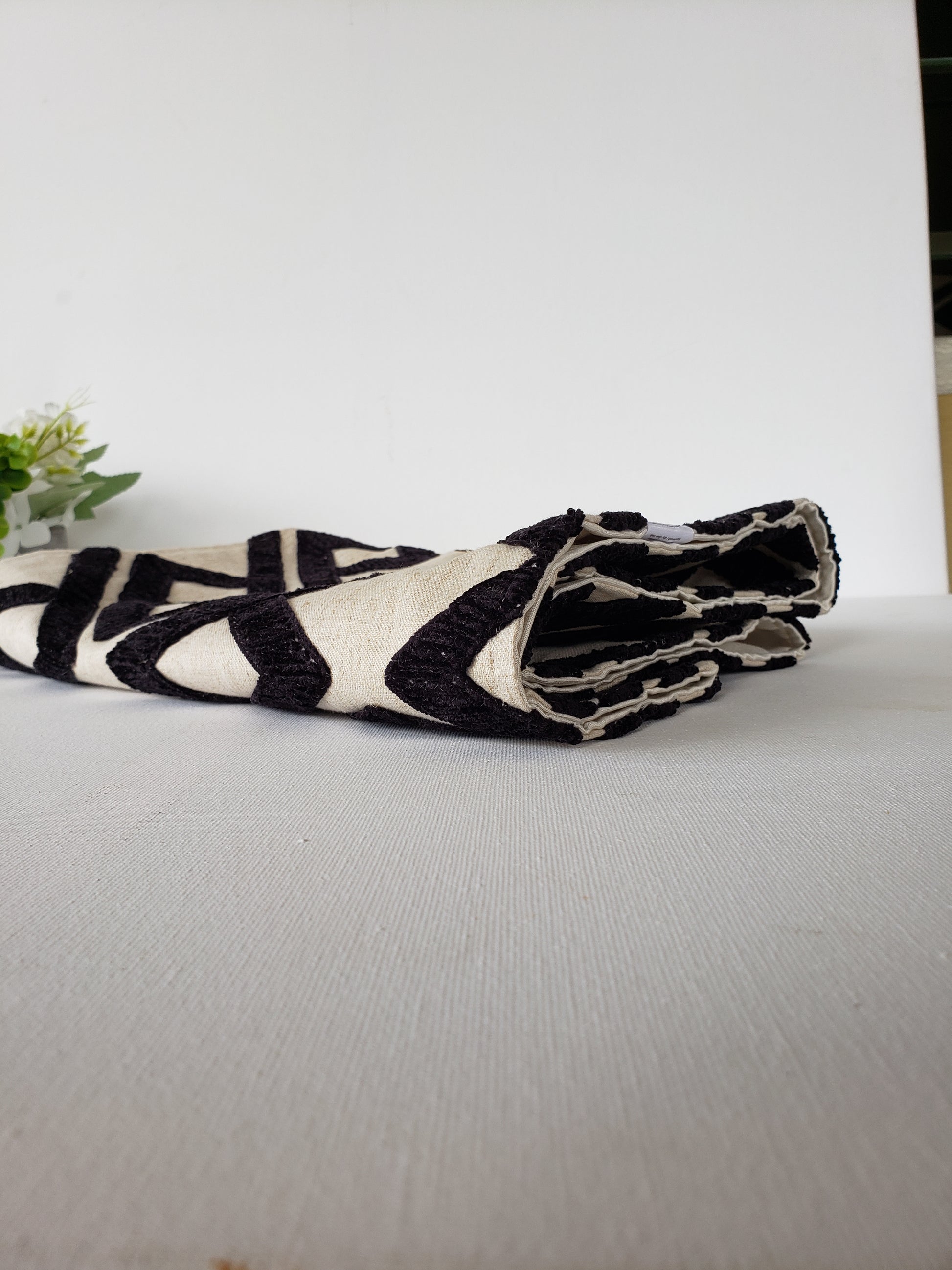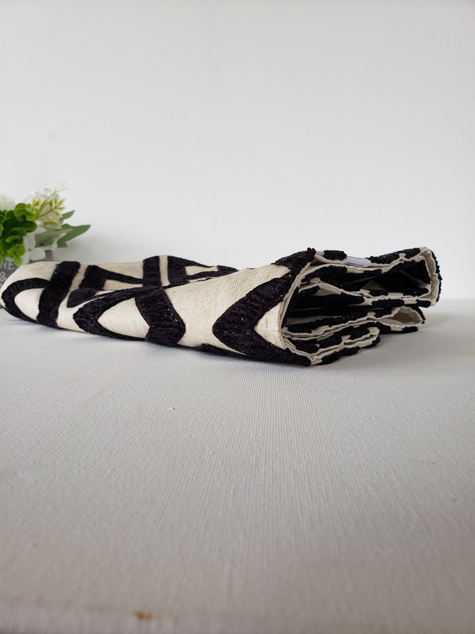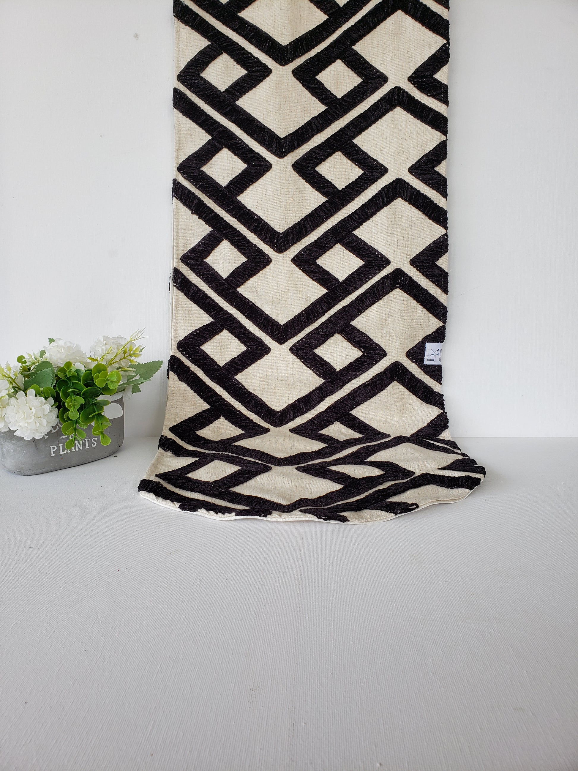 Elevate your dining experience with the Melonoid Reversible Black and Ivory Table Runner. Made from bold black, textured, and designer fabric, this durable and handmade runner adds a touch of sophistication to your table setting. Featuring the stunning Fiona Kimberly design, it's a must-have for stylish entertaining.