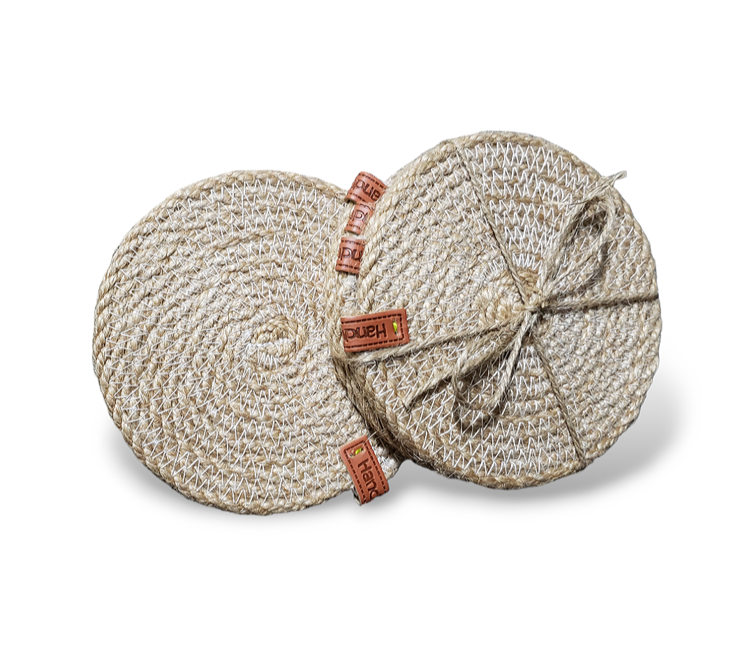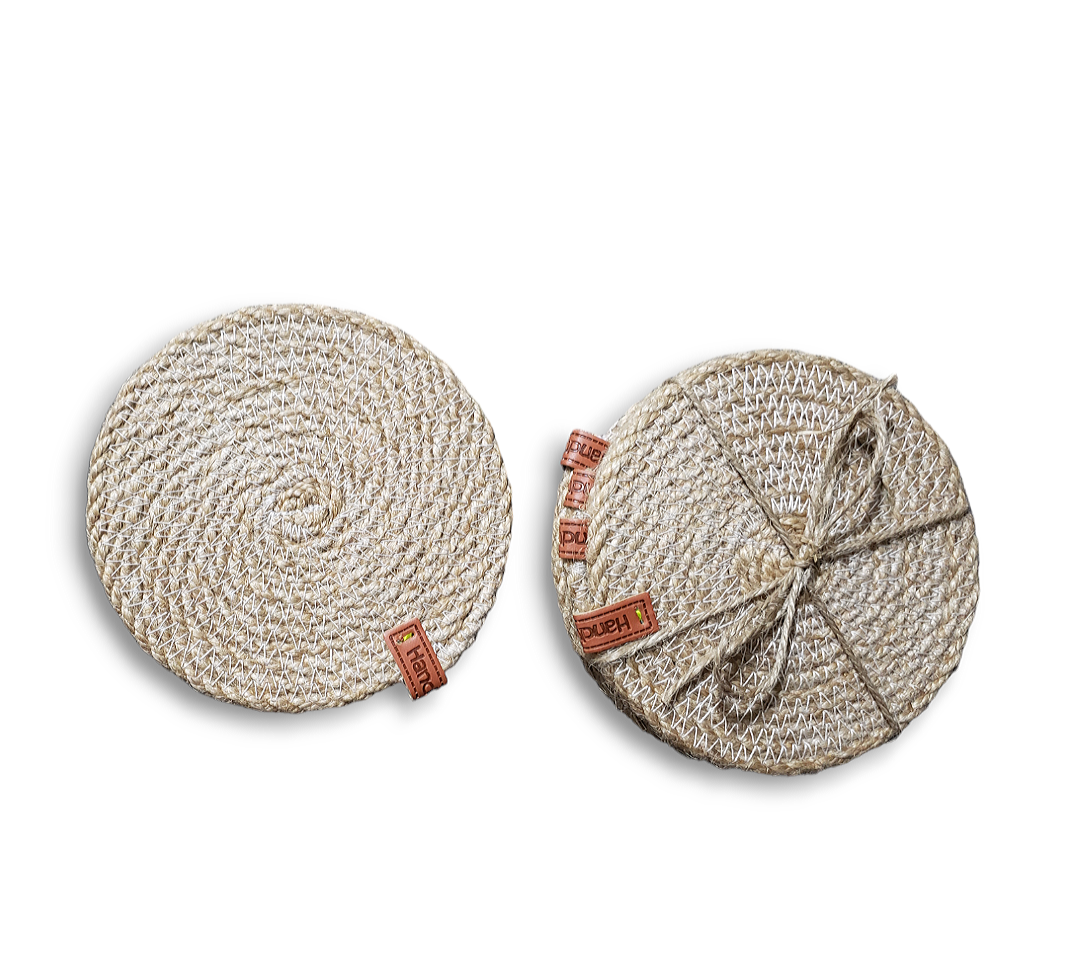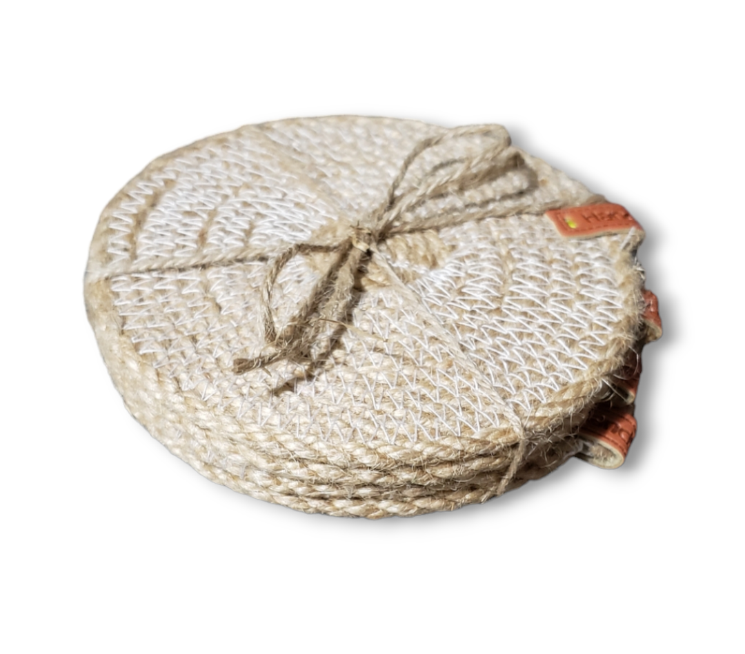Add a touch of rustic elegance to any living space with this set of four handmade jute rope coasters. Each one is meticulously crafted with durability in mind, ensuring that they will last throughout the years. These 4-inch coasters bear a tasteful charm that adds a sophisticated touch to any home.
